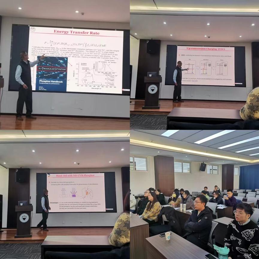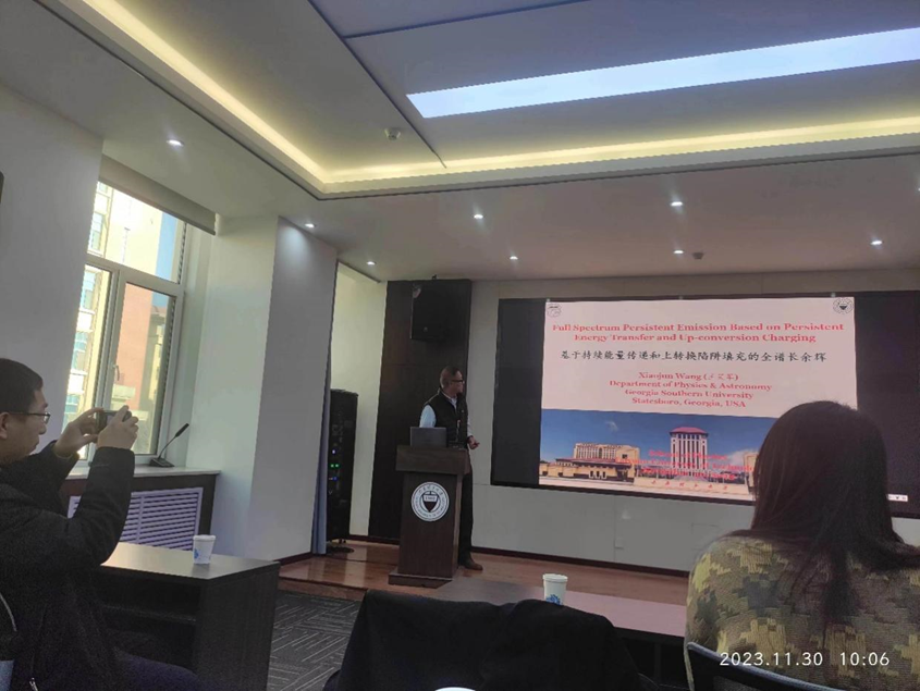20231130日上午,为了解研究领域前沿现状,激发学术热情,启迪研究思路,稀土发光课题组特邀美国南佐治亚大学王笑军教授在物理楼304会议室给课题组团队展开基于持续能量传递和上转换陷阱填充的全谱长余辉为主题的学术报告。